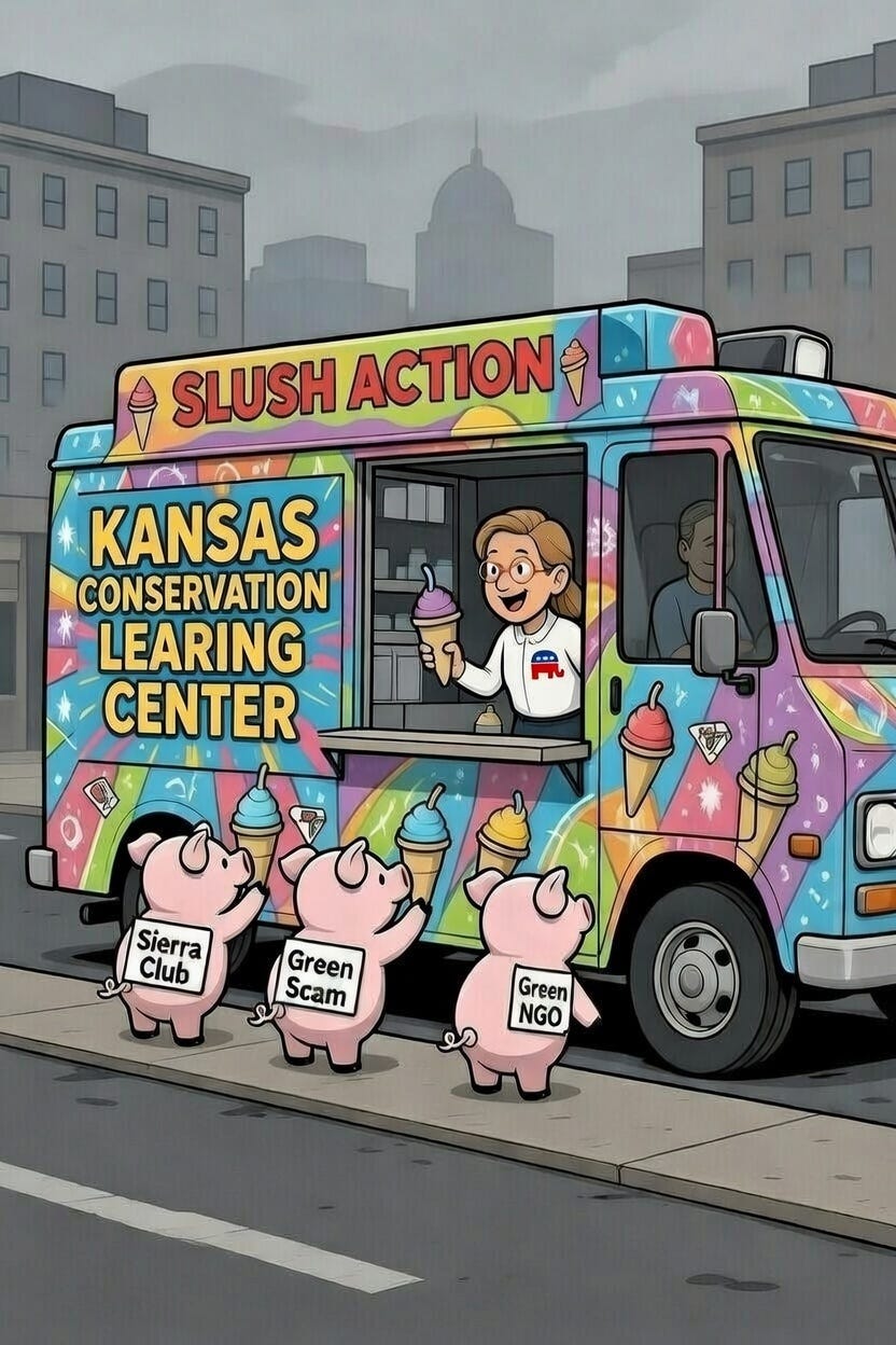 In 2025, they rebranded it as HB 2063 and jacked the ask to $60 million annually from the general fund as a negotiating tactic, creating four new funds: the State Conservation Fund as the main piggy bank, plus the Working Lands, Wildlife, and Kansas Outdoors Funds. The hearing room was again stacked with Sierra Club, Audubon, Nature Conservancy types, and pseudo ag lobbies pushing for grants that would subsidize their radical agendas – often tied to federal matching funds that impose Green New Deal-style restrictions. We called it what it was: a persistent push by leftist NGOs for an automatic, annual taxpayer-funded slush fund with almost no real oversight.